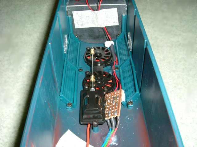 The wires from these circuit boards were brought together onto a four way connector that allowed the body to be easily removed from the chassis if required. The other half of the connector was wired back to the speed controller. The photo below shows the completed chassis assembly. The sections of the battery box that can be seen through the bodyside windows have been painted black. |