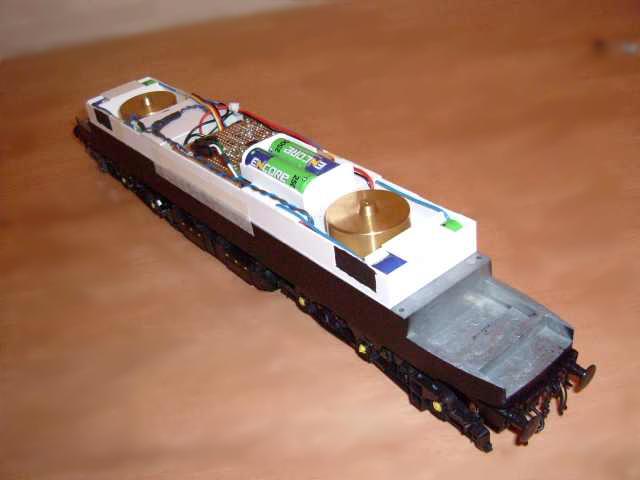 Testing revealed that the model drew between 0.5 and 2.0 Amps. Recharageable NiMH AA batteries are available in capacities up to 2.5AH, so these should give at least an hour's running time. 10 batteries are required to provide 12V. Working out how these batteries could be fitted into the body was a challenge. It was soon decided that the circuit board would have to go. Three AA batteries could just be fitted between each flywheel and the central casting. A single battery could be fitted between each flywheel and the back of the cabs. Fortunately there was just space for the two remaining batteries above the block of three batteries towards the No 2 end of the loco. (The equivalent space at the No 1 end was taken by the motor for the fans.) A battery holder was constructed from plasticard. |