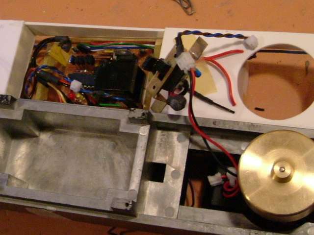 The speed controller used was a home-made item constructed on Veroboard. This fitted nicely in the central well of the metal body casting. A brass frame was made to mount it off the holes originally used for the Heljan circuit board. The fuse was also mounted in this well. The receiver fitted quite nicely in the space underneath the casting, between the bogies. It was decided to mount the on/off switch above one of the inner axles. The charging socket would be mounted next to it. The brass bracket that supports them is shown in the photo below. |