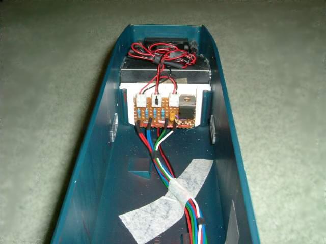 The wires from these circuit boards were brought together onto a four way connector that allowed the body to be easily removed from the chassis if required. The other half of the connector was wired back to the speed controller. The photo below shows the completed chassis assembly. The sections of the battery box that can be seen through the bodyside windows have been painted black. |